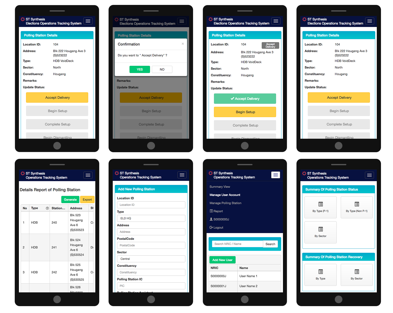 The system kept track and consolidated the real time information of the setup/dismantle of the polling system island wide.It allowed their staff to update / retrieve the key information promptly and efficiently, with comprehensive reports to allow backend admin staff to manage the progress of the setup promptly and effectively.