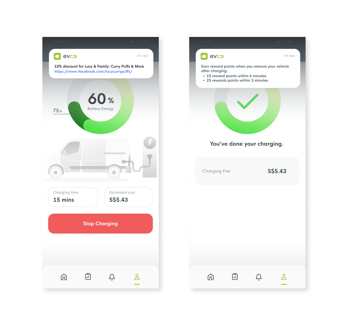 The system will send 2st notification to remind the user that he has earned reward points when he removes your vehicle after charging.